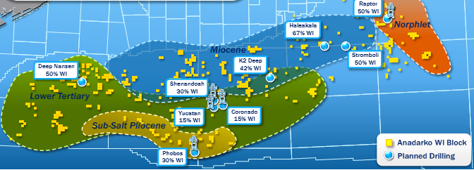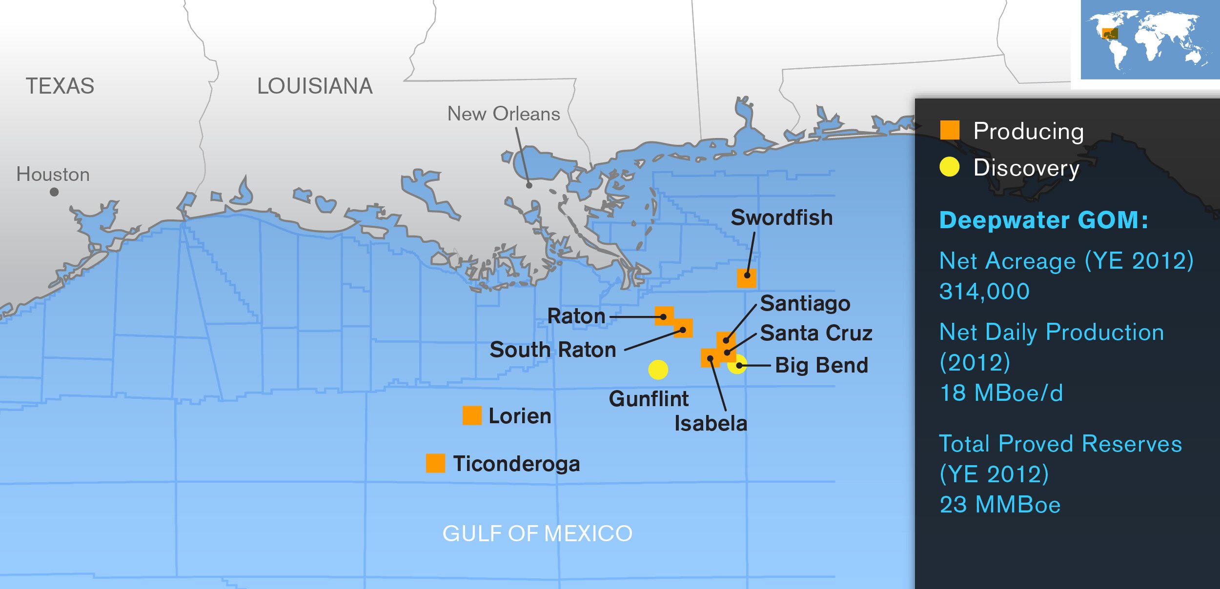 Anadarko has eight operated floating facilities such as the Caesar/Tonga Mega project, which achieved first oil in March 2012. Notably, the company is developing a few projects in the region as well. As a matter of fact, the Lucius field in the Keathley Canyon area is well under way with first oil expected in 2014. Lucius consist of a world-class reservoir quality that was assessed to contain more than 300 Mmboe, and its production was estimated at about 80,000 Bbls/d of oil.