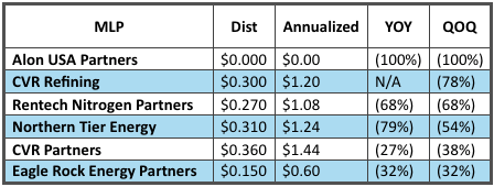First and foremost, the bulk of this list is comprised of variable-rate MLPs, which means the rules of the game change slightly when it comes to distribution increases or decreases. A rough quarter for the nitrogen fertilizer business results in CVR Partners and Rentech cutting their payout. Similar struggles in refining affected Northern Tier Energy and CVR Refining (CVRR +0.00%).