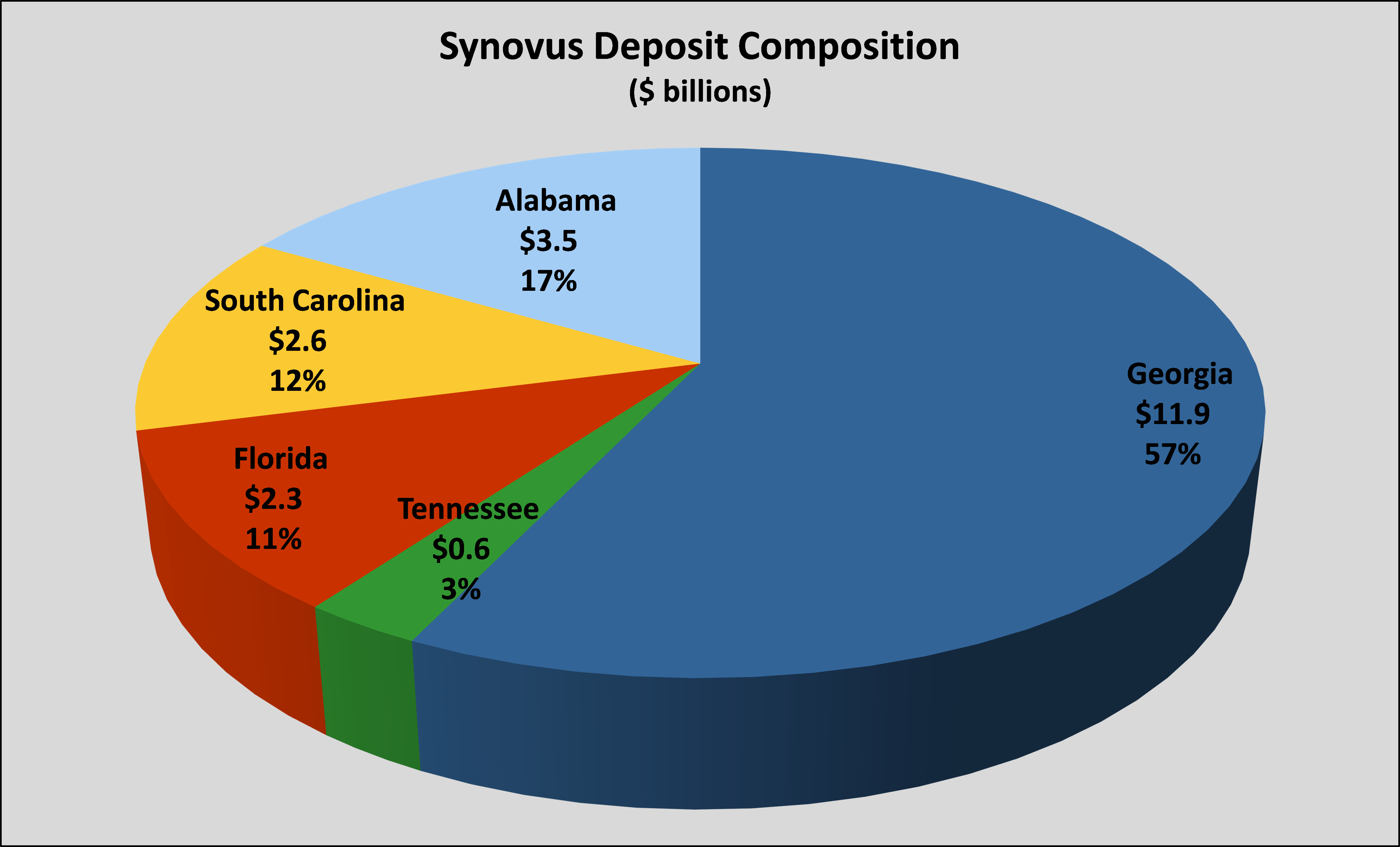 The Columbus, Ga.-based regional bank operates principally in three states: Georgia, Alabama, and South Carolina, and more than 85% of its deposits are held in those three states and the remainder of its deposits held in Florida and Tennessee, as shown in the chart below: