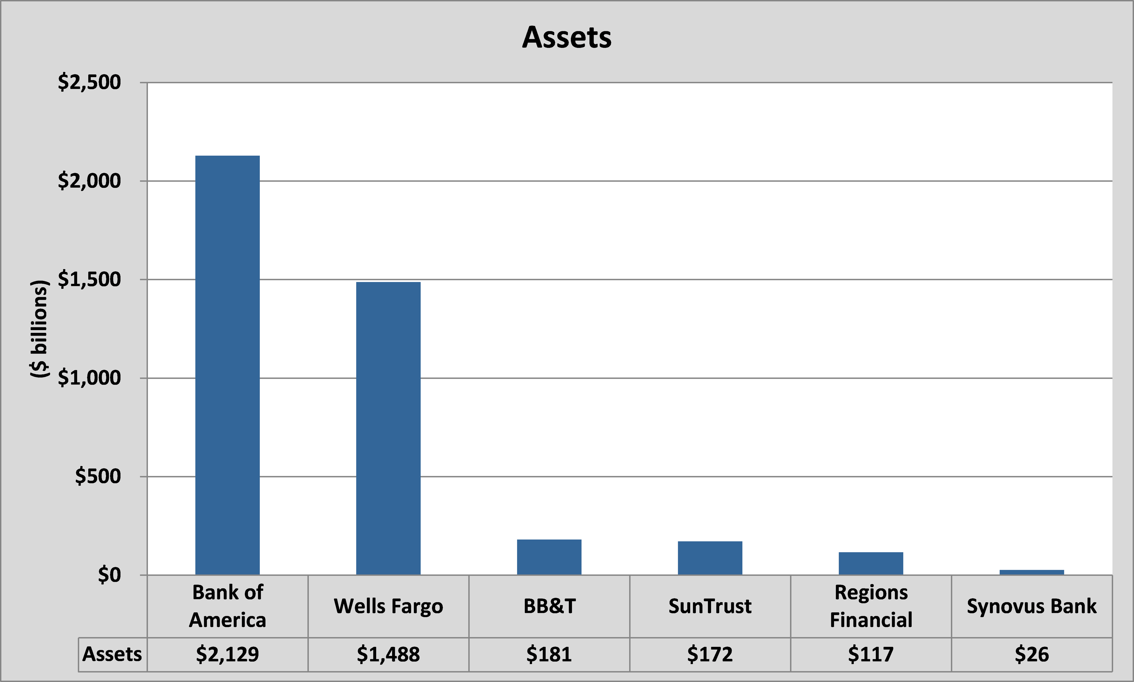 It's also mighty impressive that Synovus is even able to compete with these banks, especially when you consider that it only has $26 billion in assets and the other banks average $685 billion, which is a staggering difference:
