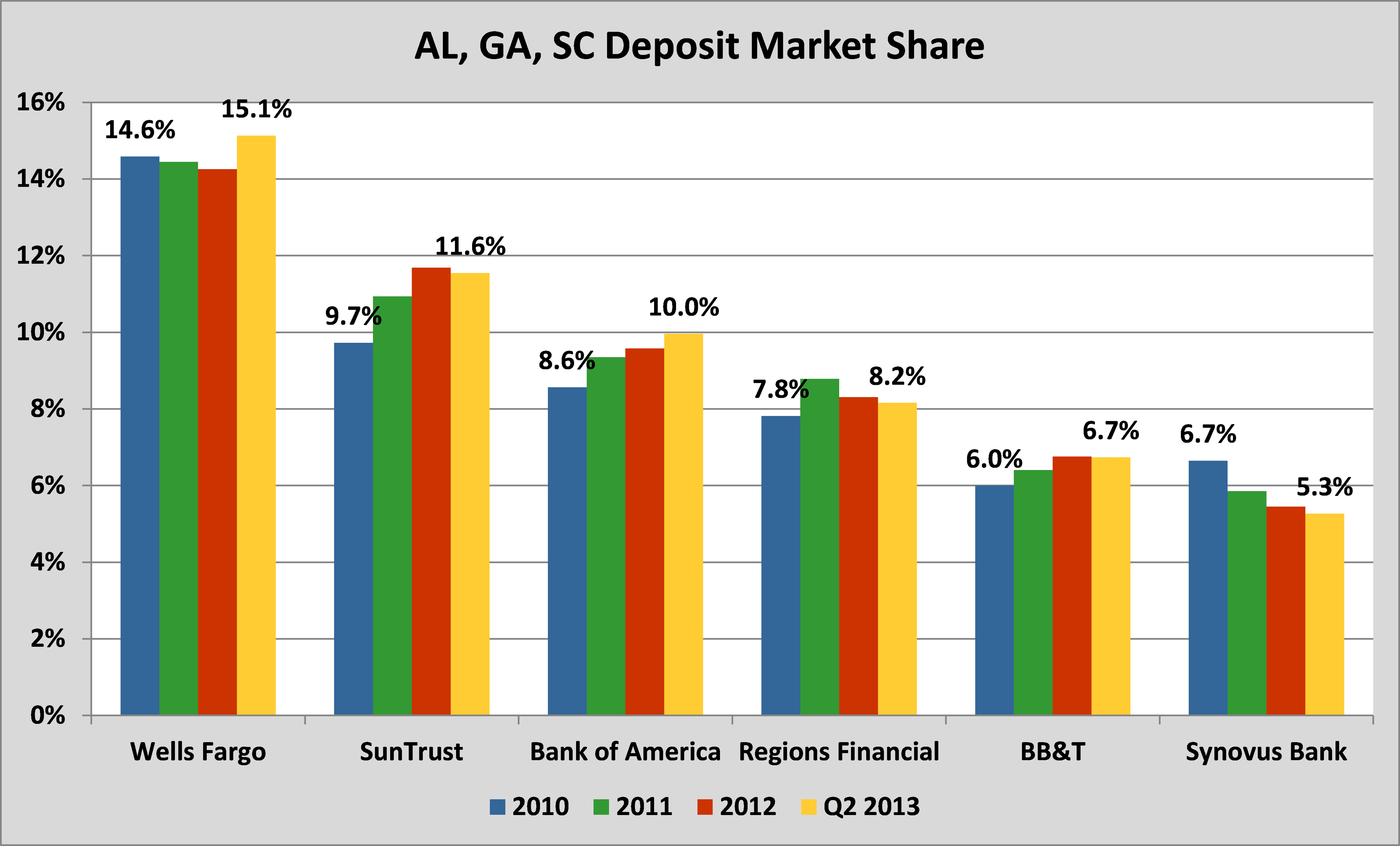 While Georgia, Alabama, and South Carolina may not conjure the thought of a heated banking battle ground, Synovus actually faces stiff competition from five better-known competitors: