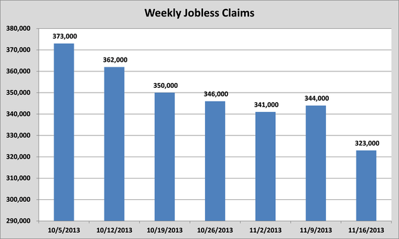 Stocks are trading mostly higher today, and the Dow Jones Industrial Average (^DJI 0.26%) is up 0.63% just after 3 p.m. EST to put it just above 16,000. Initial unemployment claims offered investors some positive news: Claims fell 21,000 to 323,000 last week -- better than the expected total of 335,000.