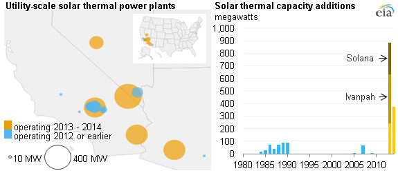 Two "massive" solar projects are set to double U.S. solar capacity. The Solana plant in Arizona produces 250-megawatts, or MW, of energy and the Ivanpah plant in California will produce 391MW. That's a grand total of 641 megawatts of power. For comparison purposes, Southern Company's (SO +0.97%) Kemper plant will produce 582MW once it's complete.