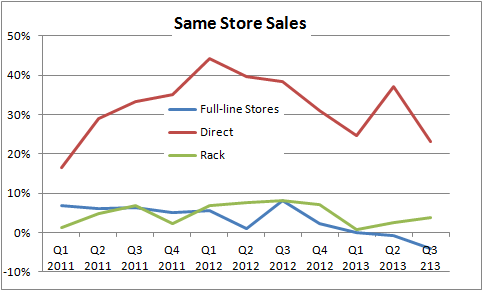 In order to illustrate the importance of the plan, here is a breakout of Nordstrom's same-store sales data. Note that the direct division includes Nordstrom's own online sales (11% of total sales) plus sales from Haute Look (2% of total sales), an off-price online company it bought in 2011. The numerically aware will have calculated that Nordstrom's full-line stores currently contribute 67% of total sales.
