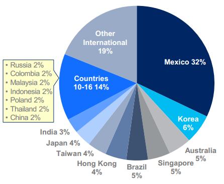 Consider its revenue composition by country over the past year, where approximately $18.5 billion, or 48%, of its total consumer banking revenue came from outside North America. It certainly has a big presence in Mexico, but it is heavily diversified elsewhere across the globe: