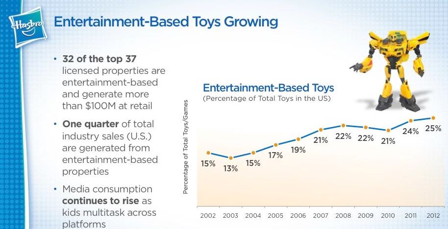 Top brand status means control of 36% of the $20 billion toy market -- and much higher prices for these top toys. In fact, entertainment-based properties grew at a compound annual growth rate of 19% to comprise 38% of Hasbro's total revenues.