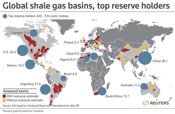The map below illustrates which nations have a strategic advantage in shale deposits.