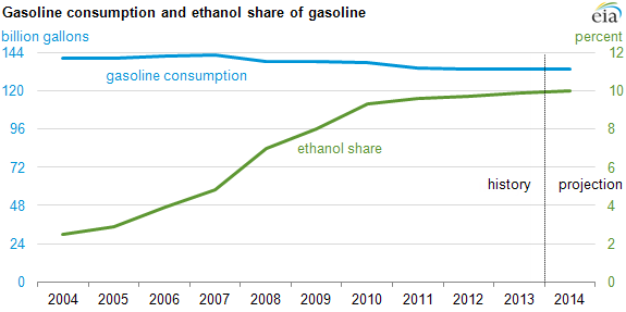 It's important to note that the concept of peak ethanol is tied to blending ratios set by regulatory agencies. Although production struggled in the last two years because of the 2012 drought, the nation's fuel supply simply cannot support more ethanol if E10 is the de facto blend. The only way to accommodate more ethanol is by requiring higher ethanol blends such as E15. However, there appear to be far too many obstacles -- market, logistics, consumer, technological, transportation -- for an E15 policy to be enacted any time soon.