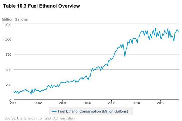 The EPA softened its stance on ethanol largely because of concerns about the Blend Wall, or the theoretical limit of 10% ethanol for a given volume of gasoline. The hard numbers easily suggest the agency was right to side with refiners and automakers. In fact, the numbers actually suggest that the United States has reached peak ethanol -- which is especially true if the proposal for 2014 is finalized. Take a look at historical monthly ethanol production.