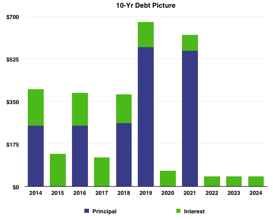 Before we overwhelm ourselves with debt metrics, we should have a solid idea of what Magellan's debt load looks like for the next 10 years. The following chart gives us just that, detailing the partnership's principal and interest payments per year for the next decade.