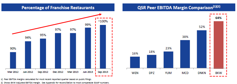 Burger King has turned itself into a 100% franchised chain over the last few years, and this franchise model has led to much higher margins than those of its competitors. It has had an increase of 3,133 basis points in adjusted EBITDA margin (now 70.2%) from the third quarter of 2012 to 2013.