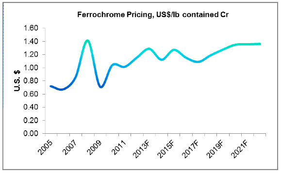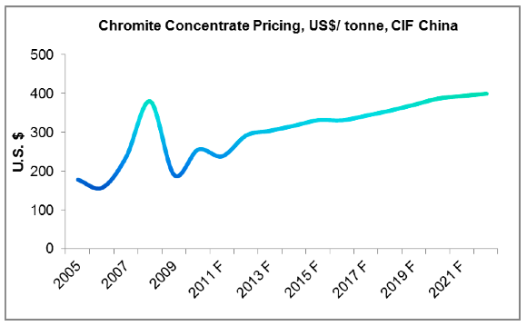 It may be better for the miner anyway. Cliffs has said it could generate an internal rate of return of 14% to 17% on the chromite project if ferrochrome prices were in the area of $1.40 per pound and that CIF China prices (cost, insurance, and freight) were $390 per tonne for chromite concentrates, but historical pricing has been nowhere near those levels by even Cliffs' own admission, suggesting it was not a feasible effort.