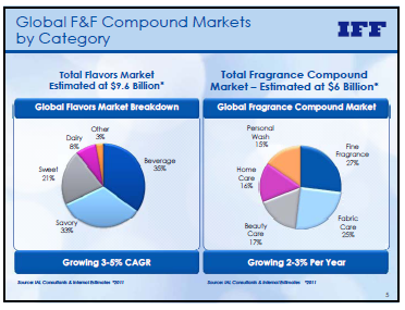 International Flavors and Fragrances, along with these three, controls 2/3 of the global flavor and fragrance market. At the Barclays Back to School conference, the company noted that it has a 16% share of the $18 billion global flavor and fragrance market.
