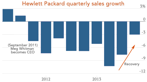 Hewlett-Packard (HPQ 0.56%) delivered amazing results this week, causing shares to go up more than 7% pre-market. Although revenue for the fourth quarter of 2013 was down 3% from a year ago, this is the smallest decline the company has posted in the past nine quarters, in percentage terms. Moreover, net income came in at $1.4 billion as a result of strong sales from the enterprise division, which is successfully offsetting falling PC sales.