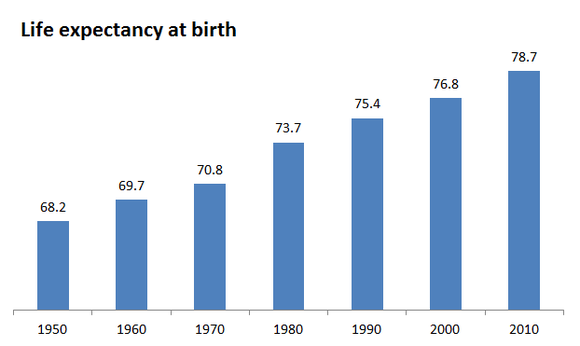 The biggest reason life expectancy has gone up is because childhood mortality has plunged, from 32 per 1,000 in 1950, to 19 in 1970, all the way down to six in 2012.