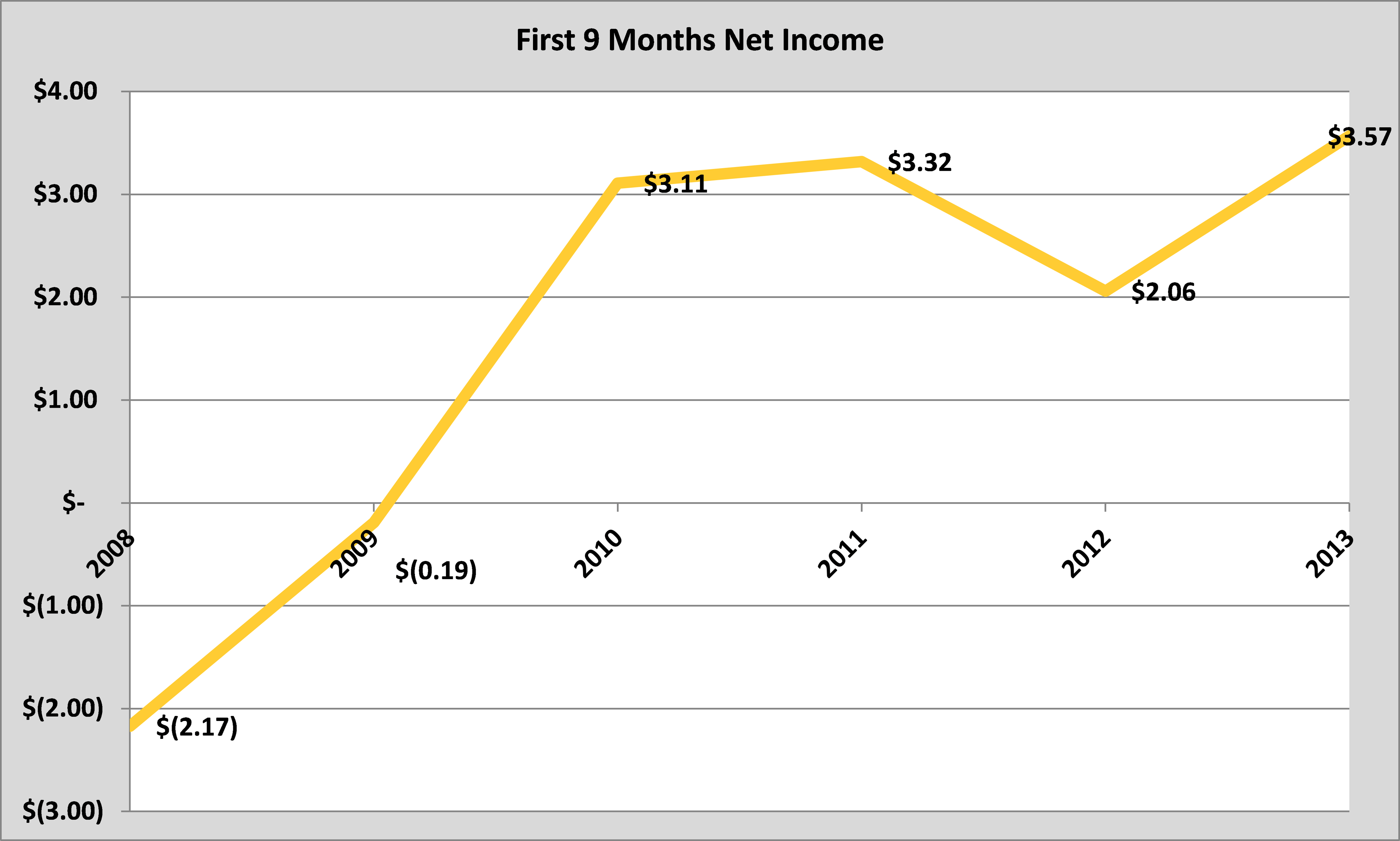 But after a rough 2012, Citigroup has seemingly begun to turn the corner and, through the first nine months of 2013, it has watched its net income rise well above where it was last year at this time, and well above the losses that were seen in 2008 and 2009: