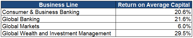 It is notable that Bank of America has watched its business line net income rise by 10% over the past year, from $10.8 billion to $11.9 billion. And you can see in the comparison against its peers that things look much better than at first glance: