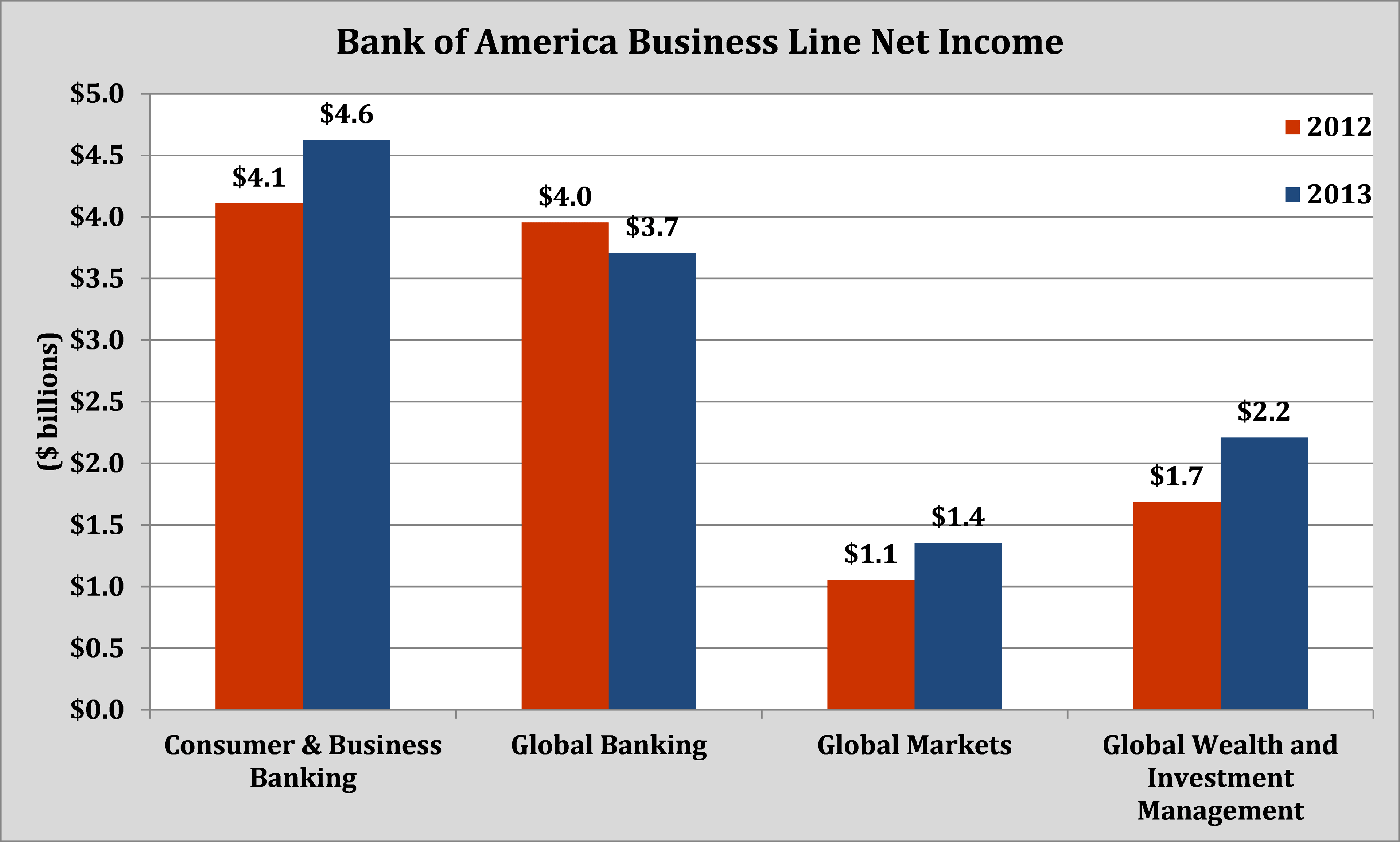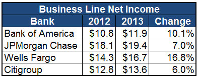 In fact, apart from the slight decline in its Global Banking business (which saw a $400 million gain from its provision for credit losses in 2012, versus a $600 million expense in 2013), each line of business has watched its net income grow in dramatic fashion relative to last year: