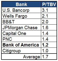 Despite its recent run, the bank's stock is still incredibly cheap. As it stands, its price to tangible book value, which measures the premium investors are willing to pay for actual equity at a bank, is among the lowest in the industry: