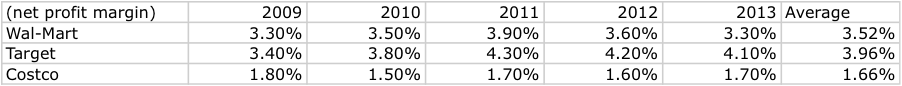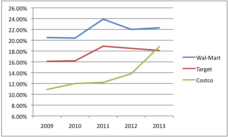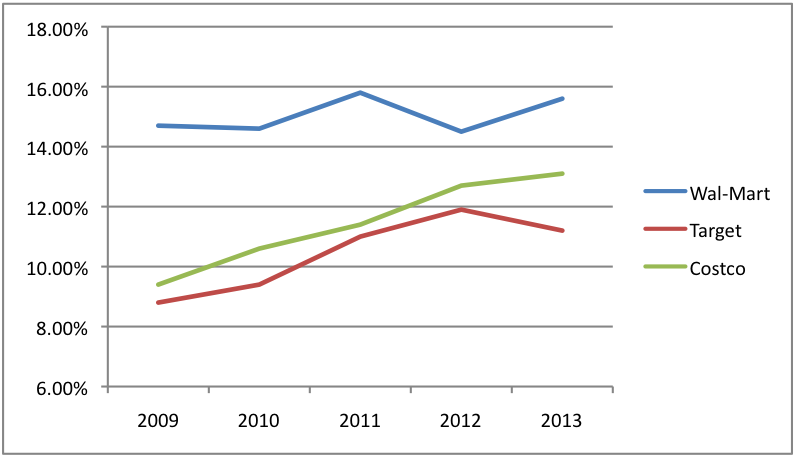 To account for these differences, I factored out both the long-term debt and tax-adjusted interest expenses of Wal-Mart, Costco and Target in the graph below: