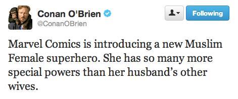One could hope that these criticisms only represent a narrow-minded minority of Americans aided by the Internet, but even Conan O'Brien chimed in, tweeting, "Marvel Comics introduces a new Muslim female superhero. She has so many more powers than her husband's other wives." -- ignoring, for comedic purposes, the fact that Khan is actually a 16-year old American girl.