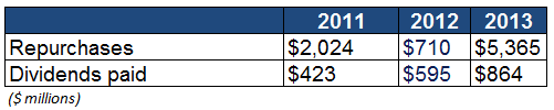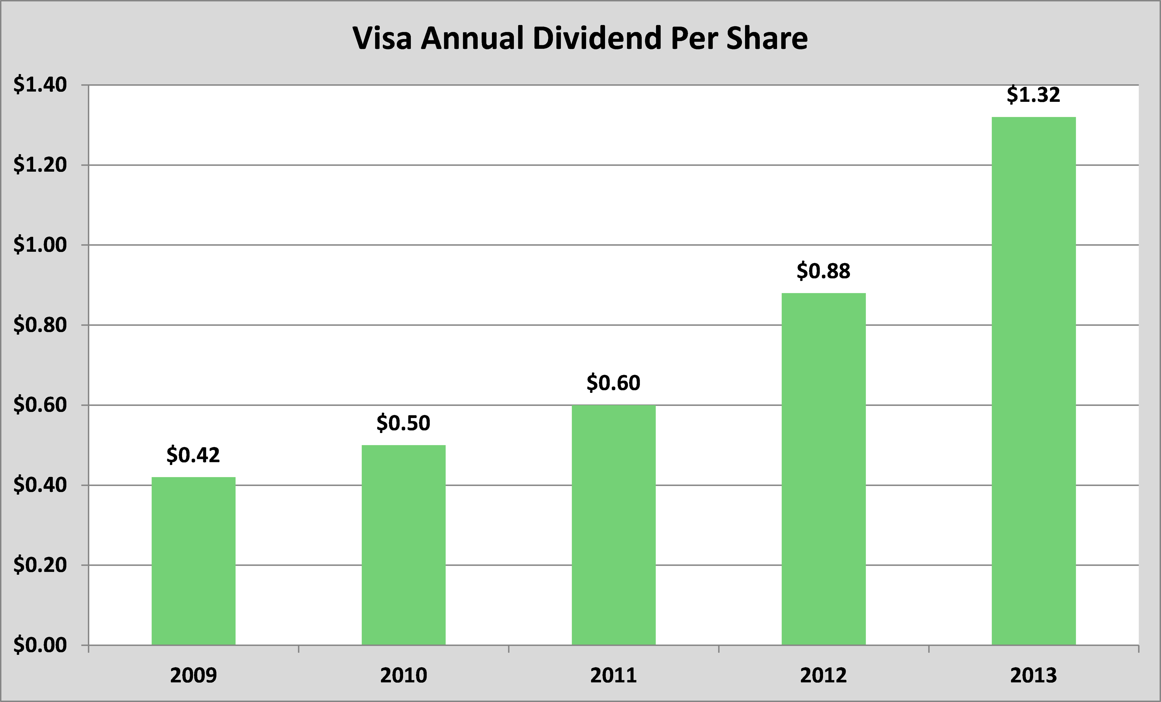 Thankfully, the answer is no, because in the 2013 fiscal year, Visa actually also repurchased an additional $5.4 billion in its common stock and paid the highest amount of dividends on record: