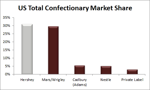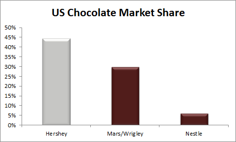 The only company that comes close to matching Hershey in the U.S. is Mars -- the company that Berkshire Hathaway helped to finance in the 2008 acquisition of Wrigley. But even Mars has just a 30% share of the U.S. chocolate market compared to Hershey's 44% share.
