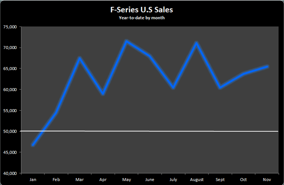 November marks the seventh straight month where F-Series sales topped not just 50,000, but 60,000. Sales of the F-Series surged 16.3% in November, higher than its main competitor, the Silverado, which saw a 12% increase -- and the F-Series is working off a higher base comparison to boot.