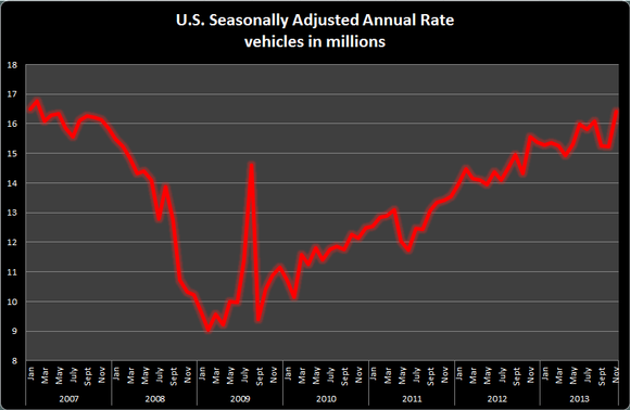 The U.S. automotive industry continued its strong rebound in November, with its fastest seasonally adjusted annual rate, or SAAR, in nearly seven years. The industry's SAAR rose to 16.4 million in November, which was far above last year's mark of 15.3 million, and well ahead of analysts' forecasts of 15.8 million.
