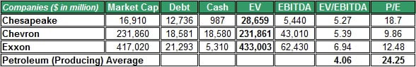 Despite Chesapeake's improvement, its valuation remains lower than its competitors. In the table below are the calculated enterprise value and EV-to-EBITDA ratios of Chesapeake, Chevron, and Exxon.