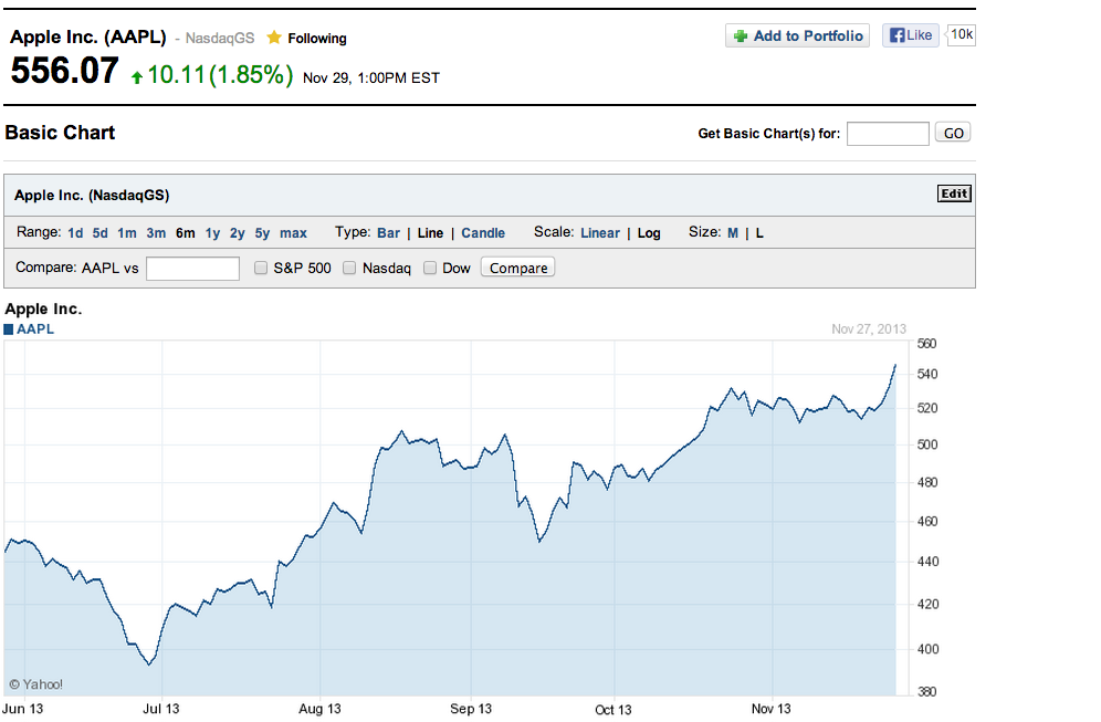Last September, Apple reached a high of just over $700 before plummeting to recent lows of $385. In late June of this year, it made a second drop below $400 before beginning its current rise. It was mid-September, however, when it really regained momentum, charging upward from $450 to Friday's (Nov. 29th) close of $556.