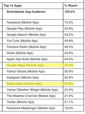 Interestingly, Apple's Maps app is gaining on Google Maps. Remember, Google Maps is available on both Android and iOS, whereas the Apple product is available only on the latter.