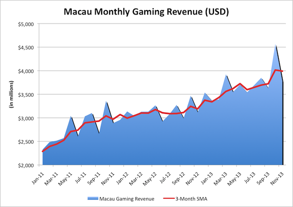 Macau continues to perform better in 2013 than almost anyone could have expected. November's gaming revenue grew 21.3% from a year ago to $3.99 billion, the second-highest month behind October.
