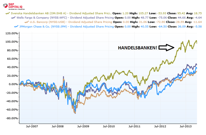 That's not a mistake: Handelsbanken's stock has roughly doubled since 2007. Take that, global financial crisis.