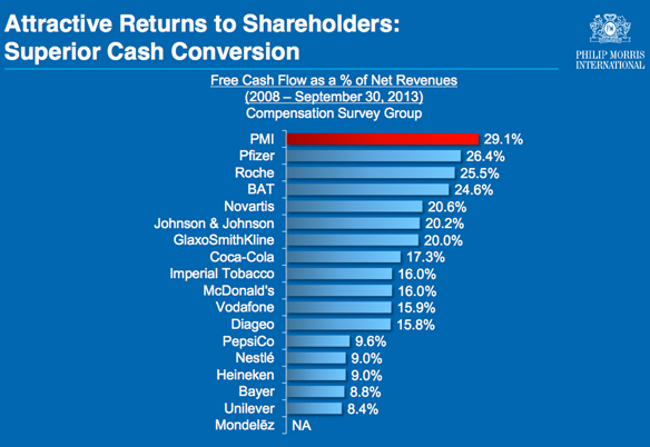 Philip Morris not only covers every market segment, it uses its tobacco supply chain knowledge and marketing expertise to constantly introduce new products. For example, the company will introduce its own e-cigarette next year in an attempt to replicate Lorillard's early success with its blu eCigs brand, which now makes up 4% of Lorillard's total revenue. This is quite an achievement if you consider that the same business unit only accounted for 1% of Lorillard's top line last year.