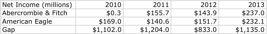 Looking at the revenue of each company over the past four years, we can see that Abercrombie & Fitch experienced the greatest growth. From 2010 through 2013, revenue rose by 54%. In comparison, American Eagle achieved 18.2% growth, while Gap brought up the rear with an aggregate growth rate of 10.2%.