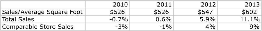 In the event that the company's sales rose as a result of a greater number of locations in operation, while comparable store sales fell, then this would be a negative sign. This simply isn't the case with American Eagle. Over the past four years, comparable store sales improved considerably, going from a 3% contraction to a positive 9% growth spurt from its 2012 to its 2013 fiscal years. By comparing this growth to the growth in total sales each year, we can see that the improvement in comparable store sales is largely responsible for the company's total growth for the years ending in 2012 and 2013.