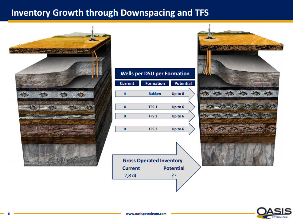 As the following slide from Oasis Petroleum (OAS +0.00%) shows, the company can drill more wells on each section through downspacing, and by tapping into additional benches of the Three Forks formation.