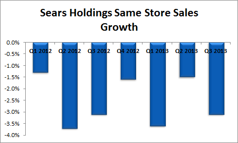 There is no disagreement that Sears Holdings is struggling. The company closed more than 300 stores in the last three years and it is still facing declining same-store sales. In the third quarter of 2013, same-store sales declined 4% at Sears, 2.1% at Kmart, and 3.1% overall.