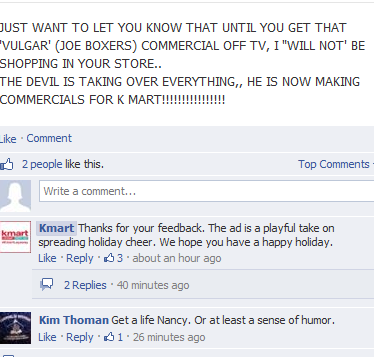 KMart's Facebook page is ablaze with indignation over a recent Joe Boxer ad where handsome guys wearing boxers shake their hips as they ring jingle bells. The following snippet is fairly representative of the all-caps fury, as well as KMart's response.