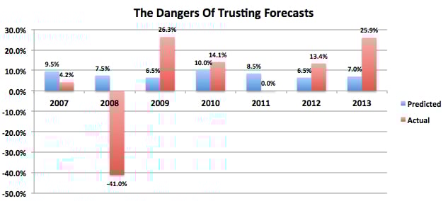 Taken as a whole, Kiplinger's predictions would have left me with returns of 70% since the beginning of 2007. But that's not the case at all. An investment in the S&P 500 (^GSPC +0.13%) in January 2007 would now be up just 26% -- less than half what was progressively predicted.