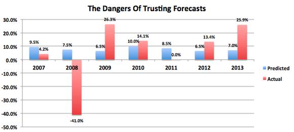 It's also a practice in futility. Take a look at Kiplinger's performance since 2007 at predicting how the market would fare in the next year.