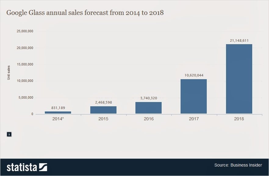 Possibilities are endless for a product like Glass, allowing almost completely hands-free operation and the ability to see both a "computer screen" and your surroundings at the same time. The addition of prescription lenses sometime next year should lead to significantly greater sales in the future. Business Insider projects an estimated "21 million units in annual sales by year-end 2018," which could be "a $10.5 billion annual market opportunity" if Glass is sold for $500 per unit.