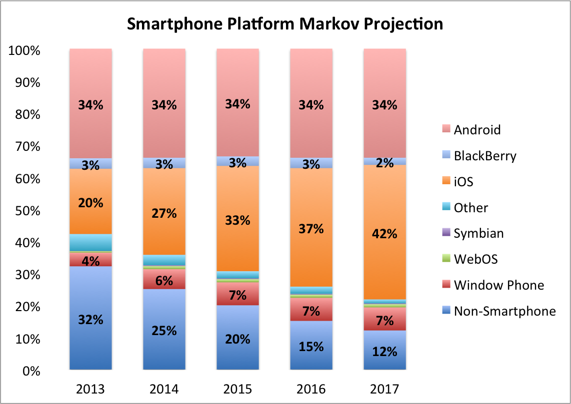 Think of the Apple and Android ecosystems as two buckets of water. New smartphone buyers -- mostly upgrading feature phone owners -- fall like rain into the two big buckets about equally, with a smaller number falling into Windows Phone and BlackBerry buckets. However, the Android bucket leaks badly, losing about one in five of all the owners put into it. The Apple bucket leaks only about 7 percent of its contents, so it retains more of the customers that fall into it. The Apple bucket will fill up faster and higher than the Android one, regardless of the fact that the Apple bucket may have had fewer owners in it to begin with.