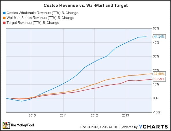Costco's success over the last years is proving that lower employee turnover, higher productivity and better service can be very profitable for investors in the long term. The company has outgrown competitors like Wal-Mart and Target by a considerable margin, and investors are getting rewarded with return rates which are not only outperforming the competition but also doing much better than the S&P 500 index over the last five years.
