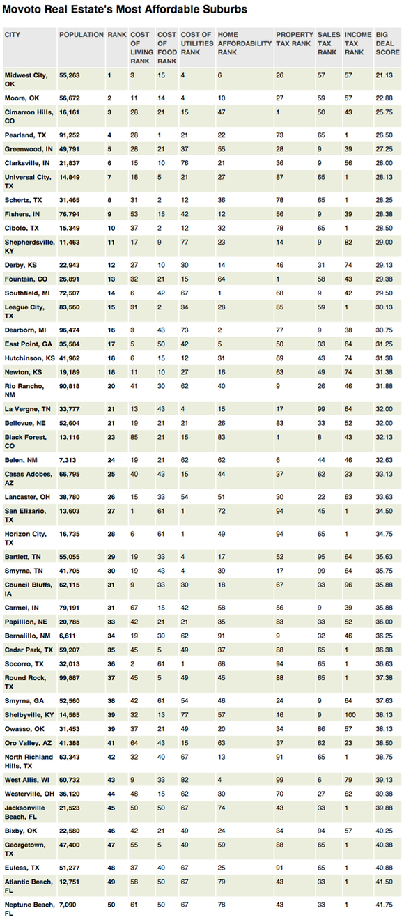 Based on our criteria and data from a survey of 139 unique suburban cities, the Movoto Real Estate Blog concluded that Oklahoma City's neighboring Midwest City, OK is the most affordable suburb in America. The full top 10 includes:
