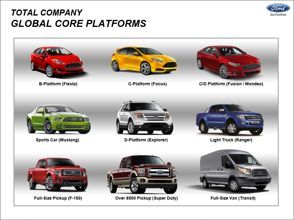 Ford's nine "global core platforms", from a presentation given earlier this year. (Yes, that's the current Mustang, not the new one). Source: Ford Motor Co.