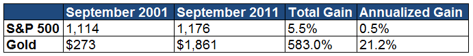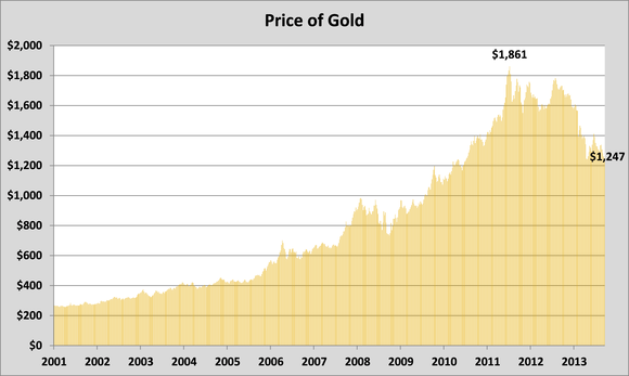 In September of 2011, the price of gold hit $1,861 per ounce, which capped off an incredible 10-year run that saw the price of gold rise on average each year by 21%.