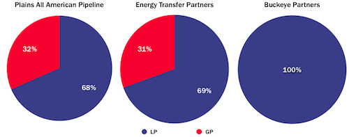 And then we have Buckeye Partners, which has no general partner and therefore pays no incentive distribution rights. It sends all of its distributable cash flow to limited partner unitholders, minus what it elects to keep on hand to maintain the partnership.