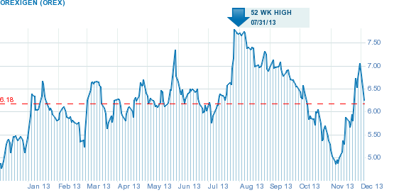 Orexigen started the year at $5.25 and currently trades at more than $6.10, down from its $7.66 peak but with a gain of 16% for the year. If Orexigen were a true medical biotech company, its current valuation could be justified; however, given the fact that its lead product candidate is a combination product of two generic ingredients, I believe Orexigen's current valuation is rather excessive.